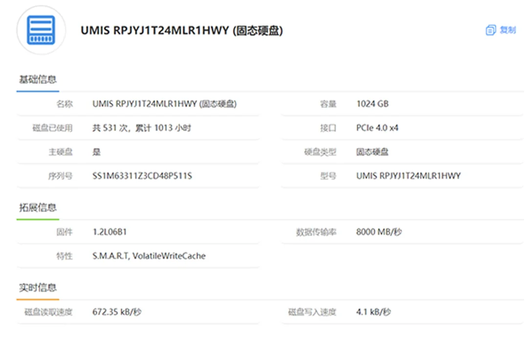 | 经检测 屏幕无划痕,机身磨损划痕,无维修,硬盘使用1013小时,激活日期24年10月19号。 | |